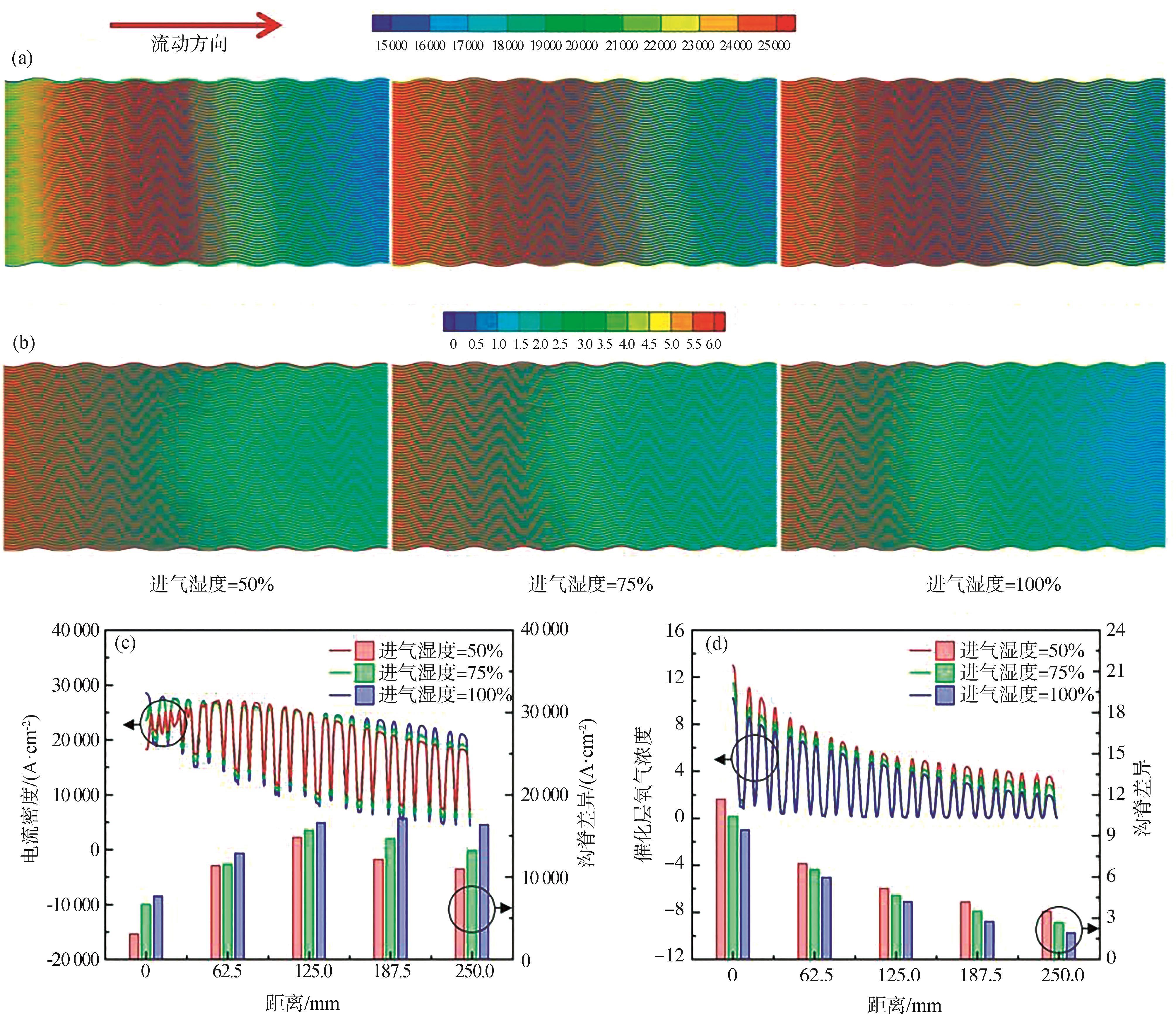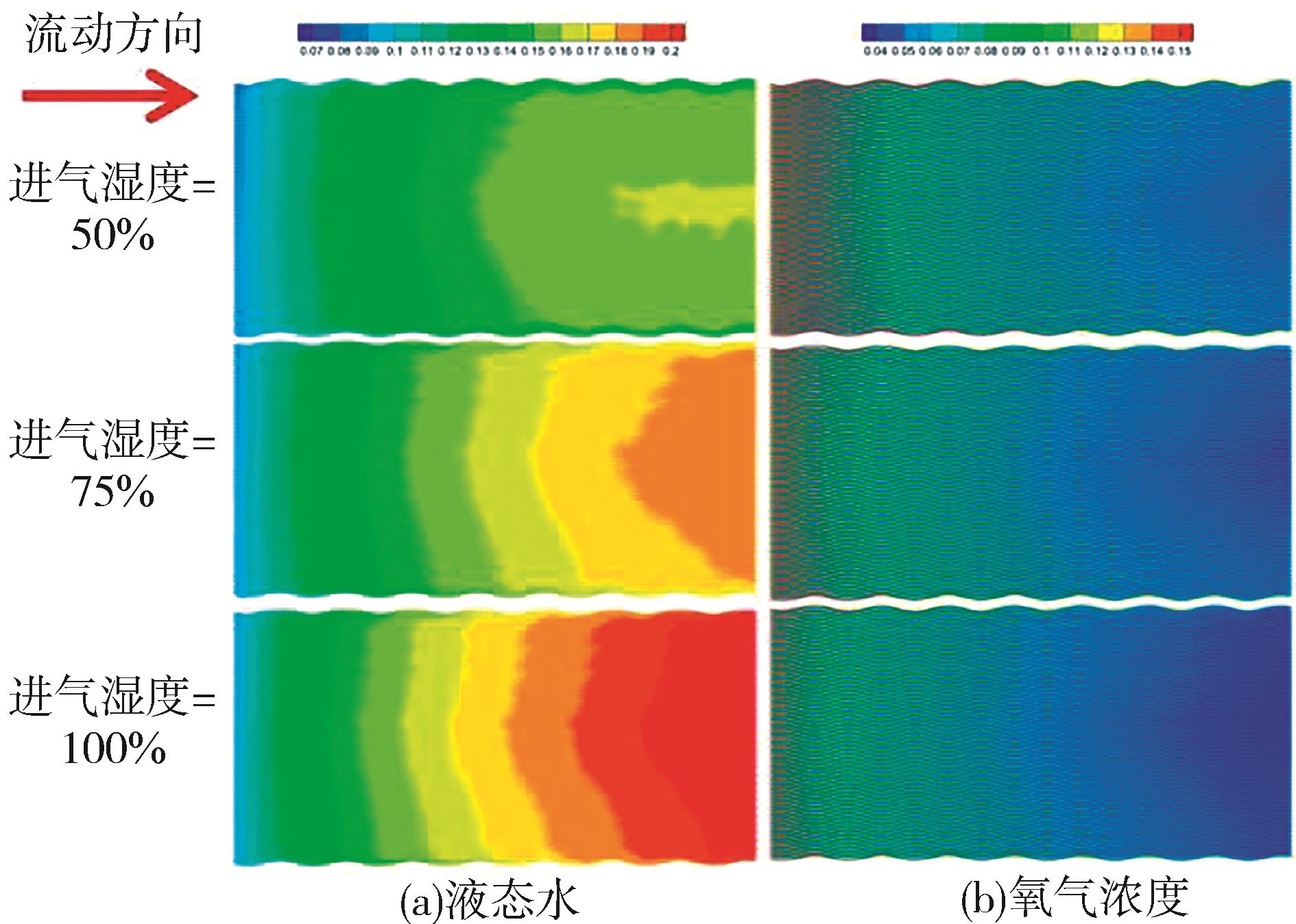 质子交换膜燃料电池(PEMFC)在复杂工况下易出现物理场分布不均,长期运行将导致局部“水淹”、“热点”或“欠气”等非健康状态,严重影响系统性能与耐久性。为深入揭示多工况下内部物理场的演化特征及其对电池运行状态的影响,本文构建了全尺寸三维多物理场耦合仿真模型,系统分析了进气化学计量比、运行温度和进气湿度3种关键工况参数对PEMFC内部水含量、氧气浓度、电流密度及温度分布的影响规律。进一步,提出了运行状态指标 Hi,结合物理场的分布特性对电池运行健康性进行量化评估。结果表明:3种工况参数均显著影响各物理场的分布均匀性及整体水平;高温、高湿或极端计量比工况下更易出现局部分布均匀性失衡,从而诱发非健康状态。研究成果可为PEMFC的运行优化与寿命管理提供理论支撑和仿真依据。