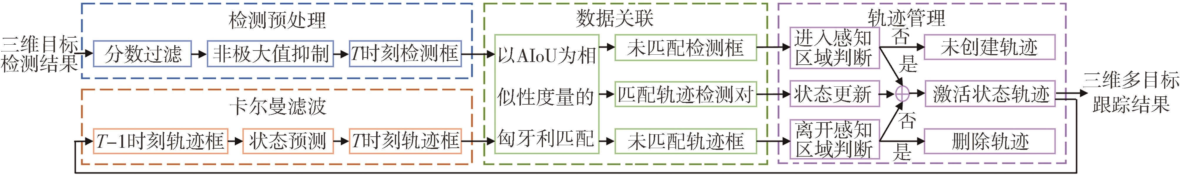 针对智能汽车在真实交通环境跟踪周围目标时面临的轨迹错误关联和过早删除问题,本文提出一种基于角度交并比和自适应生命周期的三维多目标跟踪算法。首先,采用分数过滤与非极大值抑制分别去除低置信度和重叠的检测框,结合恒定速度模型与卡尔曼滤波消除轨迹的帧间位移。其次,考虑位置和角度因素设计角度交并比,使用匈牙利算法求解二部图最优匹配。最后,根据轨迹中断与目标距离第一性原理制定自适应生命周期策略,以动态管理轨迹状况。实验表明,改进后的方法在Waymo数据集上车辆、骑车者和行人3类目标的Mismatch依次为0.07%、0.27%和0.29%,相比于基线算法分别下降0.03%、0.18%和0.21%;在nuScenes数据集上,所提方法的IDS为312次,与基线算法相比降低49.9%。提出的角度交并比和自适应生命周期能够减少身份切换次数,改进的三维多目标跟踪算法可以获得准确稳定的时序轨迹。